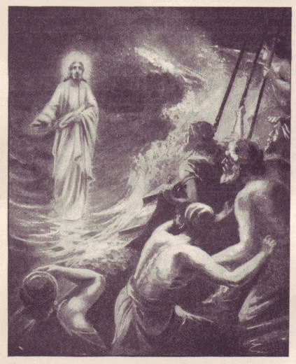 So Jesus first compelled his disciples to go on board the boat, though they were not willing to do so, and to row across the lake to Capernaum. Then he sent away the great crowd of people who were still eager that he should be their king. And when all had gone away, and he was left alone, he went up into the mountain to pray. While he was praying in the night a great storm arose upon the lake, and from the mountain Jesus could see his disciples working hard with their oars against the waves, although they could not see him. A little after midnight, when the storm was the highest, Jesus went to his disciples, walking upon the water, just as though the sea was dry land. The men in the boat saw a strange figure coming near them upon the sea, and cried out with fear, for they thought that it must be a spirit. But Jesus called out to them, "Be of good cheer; it is I; be not afraid!" And then they knew that it was their Lord.