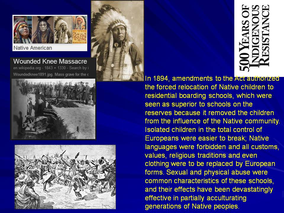 Indinigenous people culled by christian profiteers all over the globe.jpg ![]() ![]() This came from an insightful and inspiring web site which suggests that (despite human suppression, religious missions, genocidal wars & crusades against poorly armed, friendly, defenceless,pagan races, tribes, natives) still, after centuries of abuse, people refuse to accept that "they should know when they have been conquered". The G8 IMPERIALIST countries that still rule the world, ruthlessly, have hidden the history of genocides and human suppression that have culled and robbed the world's local citizens where god/gods planted them in the "first nations" amidst their villages and families. THE IMPERIALIST GOALS: VAST TRACTS OF LAND, Slavery, minerals or rare metals/diamond wealth, oil and gold & unimaginable riches and power.....THIS IS PLAGIARISED FROM THIS Well written & referenced scholarly WEB SITE. and it demonstrate how destructive globalism has been for peace loving local citizens. Indigenous Resistance © (The San Francisco Aim Chapter's demonstration of October 11, 1992. Protest against 500 Years in San Francisco....courtesy of Bobby Castillo) - reprinted from Oh-Toh-Kin, Vol. 1 No. 1, Winter/Spring 1992 This article is intended as a basic history of the colonization of the Americas since 1492, and the Indigenous resistance to this colonization continuing into 1992. The author admits to not having a full understanding of the traditions of his own people, the Kwakiutl (Kwakwaka'wakw); as such the article lacks an analysis based in an authentic Indigenous philosophy and is instead more of a historical chronology. INTRODUCTIONThat was no "Discovery" -- it was an American Indian Holocaust! Until recently, commonly accepted population levels of the indigenous peoples on the eve of 1492 were around 10-15 million. This number continues to be accepted by individuals and groups who see 1492 as a "discovery" in which only a few million Indians died -- and then mostly from diseases. More recent demographic studies place the Indigenous population at between 70 to 100 million peoples, with some 10 million in North America, 30 million in Mesoamerica, and around 50 to 70 million in South America. THE PRE-COLUMBIAN WORLDIn fact, it was not even called "America" by those peoples. If there was any reference to the land as a whole it was as Turtle Island, or Cuscatlan, or Abya-Yala. The First Peoples inhabited every region of the Americas, living within the diversity of the land and developing cultural lifeways dependent on the land. Their numbers approached 70-100 million peoples prior to the European colonization. Generally, the hundreds of different nations can be summarized within the various geographical regions they lived in. The commonality of cultures within these regions is in fact a natural development of people building life-ways dependent on the land. As well, there was extensive interaction and interrelation between the people in these regions, and they all knew each other as nations. In the Arctic region live(d) the Inuit and Aleut, whose lifeways revolve(d) around the hunting of sea mammals (Beluga whales, walruses, etc.) and caribou, supplemented by fishing and trading with the people to the south. South of the Arctic, in the Subarctic region of what is today Alaska, the Northwest Territories, and the northern regions of the Canadian provinces, live(d) predominantly hunting and fishing peoples. The variations of these lands range from open tundra to forests and lakes, rivers, and streams. The Cree, Chipewyan, Kaska, Chilcotin, Ingalik, Beothuk, and many other nations inhabit(ed) this region, hunting bear, goats, and deer in the west, musk oxen and caribou further north, or buffalo further south in the prairies. Altogether in the Arctic and Subarctic regions there lived perhaps as many as 100,000 people. On the Pacific Northwest coast, stretching from the coasts of Alaska and BC down to northern California, live(d) the Tlingit, Haida, Tsimshian, Kwa-Kwa-Ka'wakw, Nuu-chah-nulth, Nuxalk, Salish, Yurok, and many others. These peoples developed a lifeway revolving around fishing. The peoples of this region numbered as many as four million. Between the Pacific coastal mountain range and the central plains in what is today southern BC, Washington, Oregon, Idaho and Montana, live(d) the Sahaptin (Nez Perce), Chopunnish, Shoshone, Siksikas (Blackfeet), and others. These peoples numbered around 200,000. To the east were people of the plains, encompassing a vast region from Texas up to parts of southern Alberta, Saskatchewan, and Manitoba, eastward to North and South Dakota, Minnesota, Wisconsin, Missouri, and Arkansas. Here, the Lakota (Sioux), Cheyenne, Arapaho, plains Cree, Siksikas (of the Blackfeet Confederacy, including the Blood and Peigan), Crow, Kiowa, Shoshone, Mandan, and many others, numbered up to one million, and the buffalo as many as 80 million before their slaughter by the Europeans. Further east, in the lands stretching from the Great Lakes to the Atlantic coast, live(d) hunting, fishing, and farming peoples; the Kanienkehake (Mohawks), Oneida, Onondaga, Cayuga, Seneca (these five nations formed the Haudenosaunee -- the People of the Longhouse -- also known as the Iroquois Confederacy), Ojibway, Algonkin, Micmac, Wendat (Huron), Potowatomi, Tuscarora, and others. In this woodland region, stretching from Ontario, Quebec, and New York, down to the Carolinas, lived up to two million peoples. South of this area, from parts of the Virginias down to Florida, west of the Gulf of Mexico including Mississippi and Louisiana, live(d) The Muskogee-speaking Choctaw, Creek, and Chikasaw, the Cherokee, Natchez, Tonkawa, Atakapa, and others. One of the most fertile agricultural belts in the world, farming was well established supplemented by hunting and fishing. These peoples numbered between two and three million. East of this area, in the south-western United States, extending down to northern Mexico