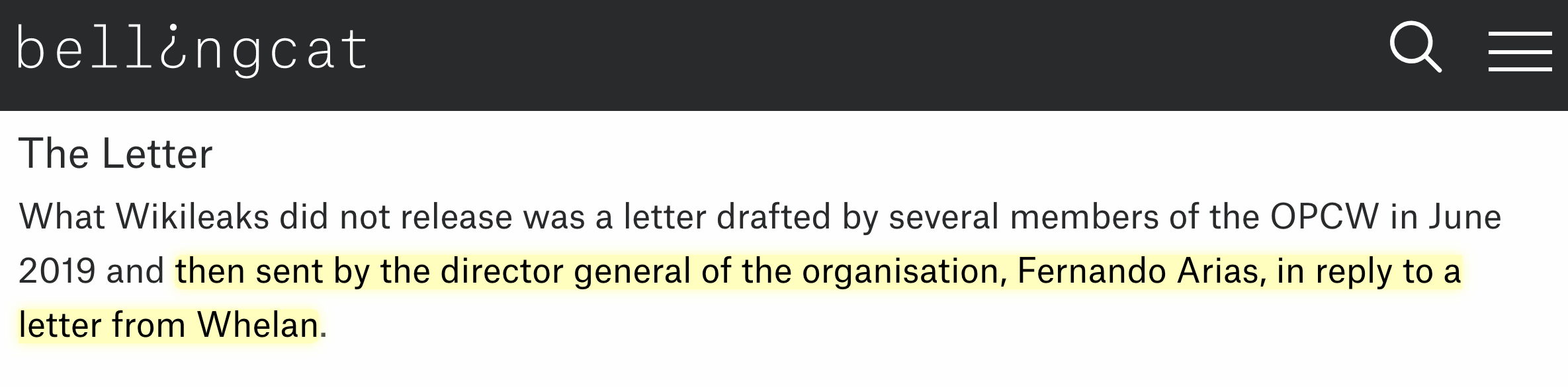 According to Bellingcat, the letter was “drafted by several members of the OPCW in June 2019 and then sent by the director general of the organisation, Fernando Arias, in reply to” Dr. Whelan.