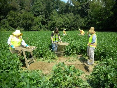 My son Thomas went with me into the field today; here he helps Mary and Katy dig a test unit in the soybean field.