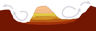 Mount Sharp is a mystery to geologists. It looks like a mountain, but it seems to be made of layers of sediment from top to bottom. The lower layers look like they were formed in water, but not the upper layers. How did it form? One theory is that it was built up by two different episodes of deposition. The first was formed in a lake that filled the crater.
