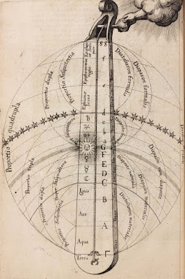In this fantastic image by a late Neoplatonist, the Aristotelian cosmos aligns with a cosmic monochord tuned by the hand of God, where each planet corresponds to a musical tone.