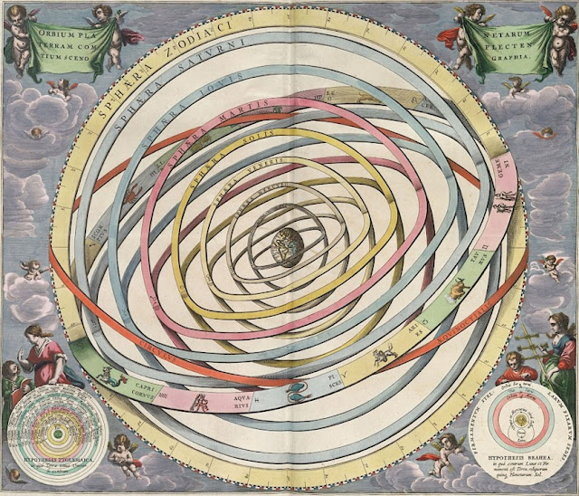 In the Ptolemaic cosmos shown above, the fusion of ancient astronomy, astrology, and mythology with Aristotelian causality is complete. The universe becomes a vast pertpetual motion machine of spinning, interlocking parts, the movements of which drive causal action in the Earth at the center. The interaction between spheres accounts for observed planetary motion, and provides an explanatory mechanism for astrology: the signs read by astrologers are indices of the movement of the spheres that drive worldly events. One final issue to account for was change; things in the world are always shifting - birth, growth, decay, etc. - while things in the sky seem changeless. Aristotle argued that the sublunary zone, or innermost space within the moons's orbit and including the Earth, was subject to change, while the cosmic spheres were timeless.