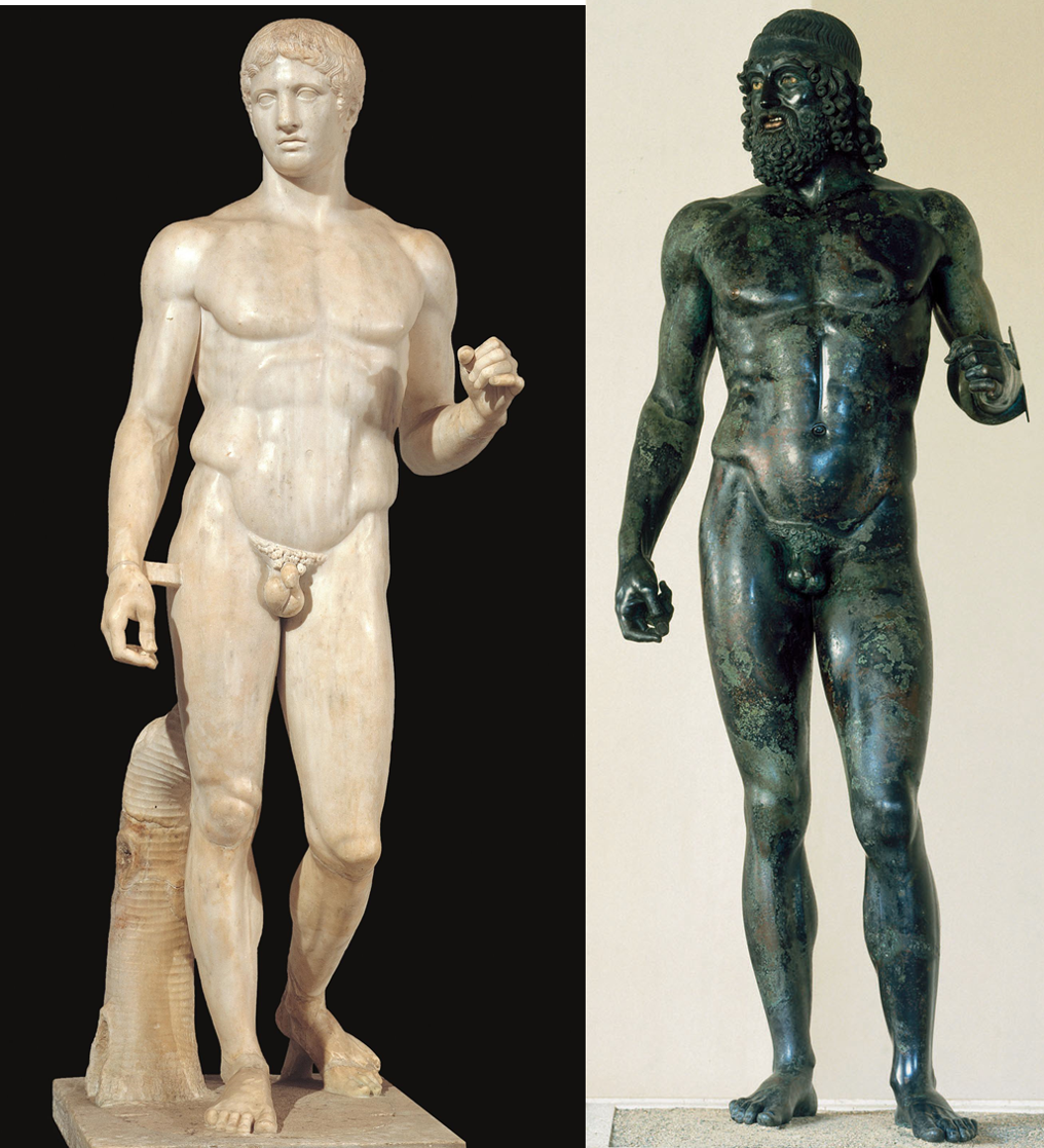 In his lost Canon, Greek sculptor Polykleitos established the ideal proportions for a human figure. His work only survives in relatively crude Roman copies like the one on the left, but the consistent application of his compositional principles can be seen in the stunning original Greek bronze on the right.