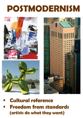 The visual arts are at the top of the list of venues where the general public encounters Postmodernism directly. We are all familiar with the confusion, revulsion, and/or dismay that accompanies a piece of "abject" art or the sight of a monstrous architectural form. But Postmodernism in architecture is quite narrowly defined, and while it is dehumanizing, many of the works people find off-putting are technically Modernist, to be precise in terms of historical periodization. A quick summary:
