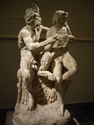 Naked lust knows no natural boundaries and Pan was a willing switch-hitter. The sexual overtones are obvious in the goat-god's expression and the placement of his leg. The connection between the wild music of the pipes, sexual abandon, and transgressive behavior is also clear.