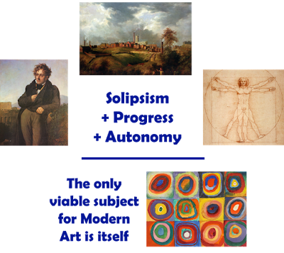 This story only makes sense within the context of an autonomous art world that mimics Modern Progress in other areas. Note how innovations that were specifically French precipitate an international Modernism that is detached from the nations of its practitioners. Note the parallel with international economics - the elites serve their interests over their nations'.