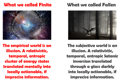 This is a follow up to the last post with a closer look at the nature of mathematical allegory. The inspiration came from a question that raised the issue of the relationship between mathematics, allegorical representation, and material reality. The post was written quickly and covered a lot of territory, so it is not surprising that some clarification is in order. The planned topics will be back - cultural inversions and the occult are on deck. It's just that one of the rewards of creating the Band is having a venue for tackling interesting things when they occur, and the entropic-Satanic-globalist homology has been hard to stop thinking about since it came up last week. And it is relevant to Postmodern inversion. So lets try and clean up the relationship between math, empirical experience and the limits of discernment in a finite fallen world.