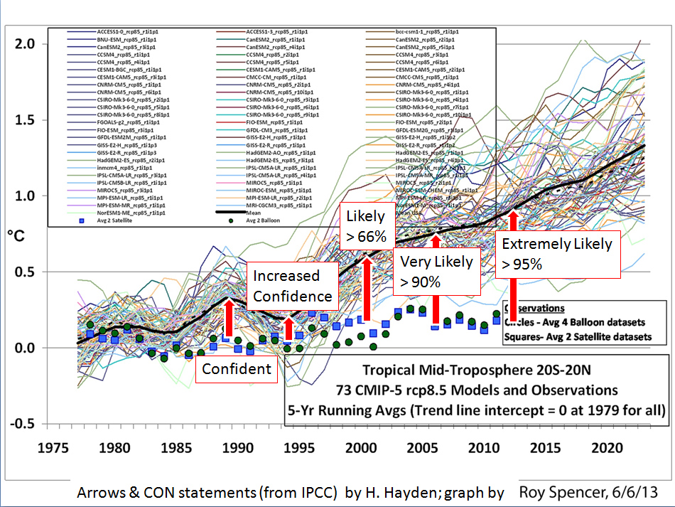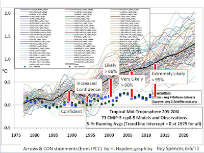 ...as was the case with hot earth conspiracy theory. Here is some data compiled by Howard Hayden comparing 73 climate models (mean in solid black) with satellite and weather balloon measurements. The red arrows show IPCC language and the associated degree of certainty about their modeling.