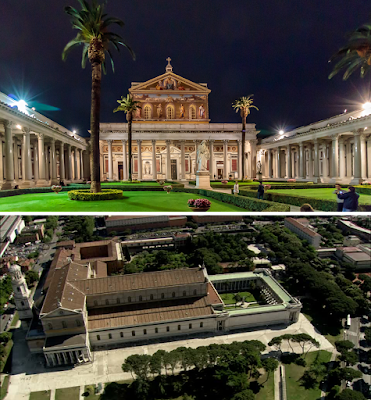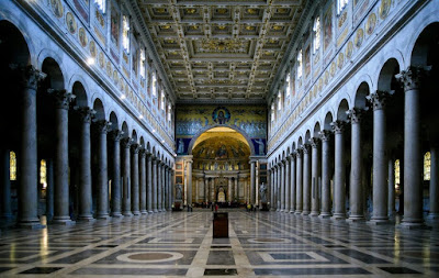 The oldest really big Roman churches weren't vaulted at all. The imperial basilicas of the 4th and 5th centuries had wood beam roofs. St. Paul's Outside the Walls was founded by the first Christian emperor on the side of the apostle's martyrdom. It is in good shape because it was relatively unmodified after the Theodosian rebuilding until the nave burned in 1823. The church was rebuilt as closely to its prior appearance as possible.