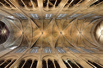 Gothic builders solved the weight problem with the sort of ingenuity that reveals the notion of a Dark Age as the Renaissance lie that it was. They realized that a lattice of arches could carry the weight of the roof because the spaces in-between didn't have to support anything and could be filled with lighter materials. The ribs still converge on corner piers like the groin vaults did, but since they weigh so much less, the supporting walls could be much thinner.