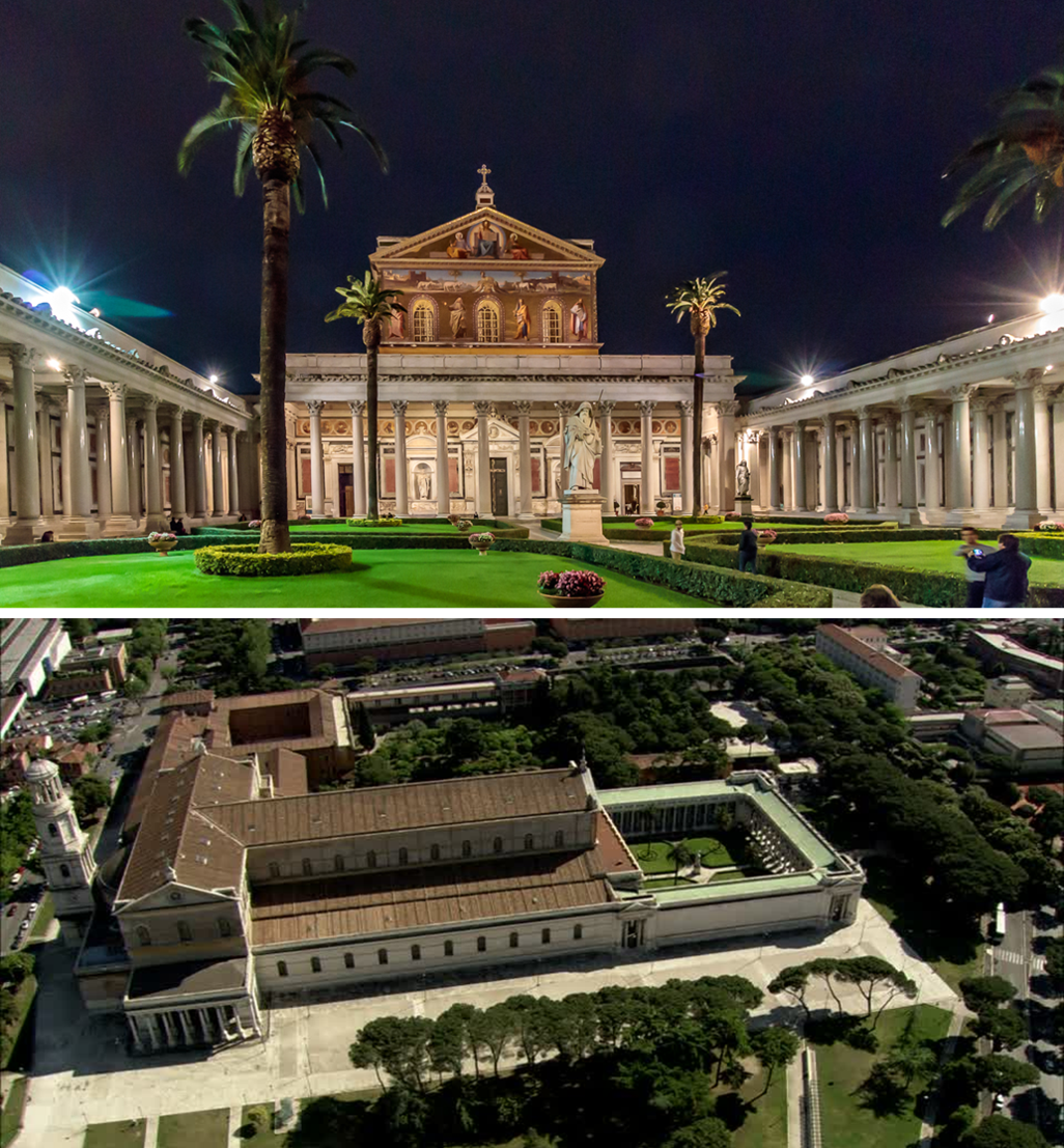 San Paolo fuori le Mura, founded by Emperor Constantine and consecrated in 324, rebuilt by Emperor Theodosius I beginning 386, and renovated by Pope St. Gregory the Great after 590; cloister added between 1220 and 1241; nave rebuilt 1823-40, Rome