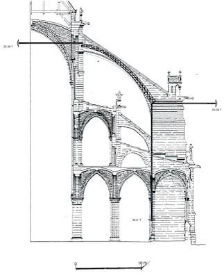 Notre-Dame was the prototype of big Gothic cathedral, and the flying buttresses were still being worked out when construction started. The finished project is brilliant - a lattice of ribs and flying buttresses in suspension with thin walls and huge windows.