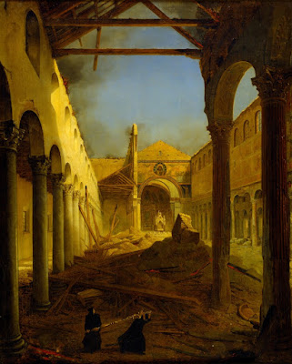 Léopold Robert, The Church of San Paolo fuori le mura the Day after the Fire of 1823, 1825, Thorvaldsen's Museum, Copenhagen; Giovanni Paolo Panini, San Paolo fuori le Mura, 1750, oil on canvas, Private collection; stock photo of engraving of the interior after the fire.