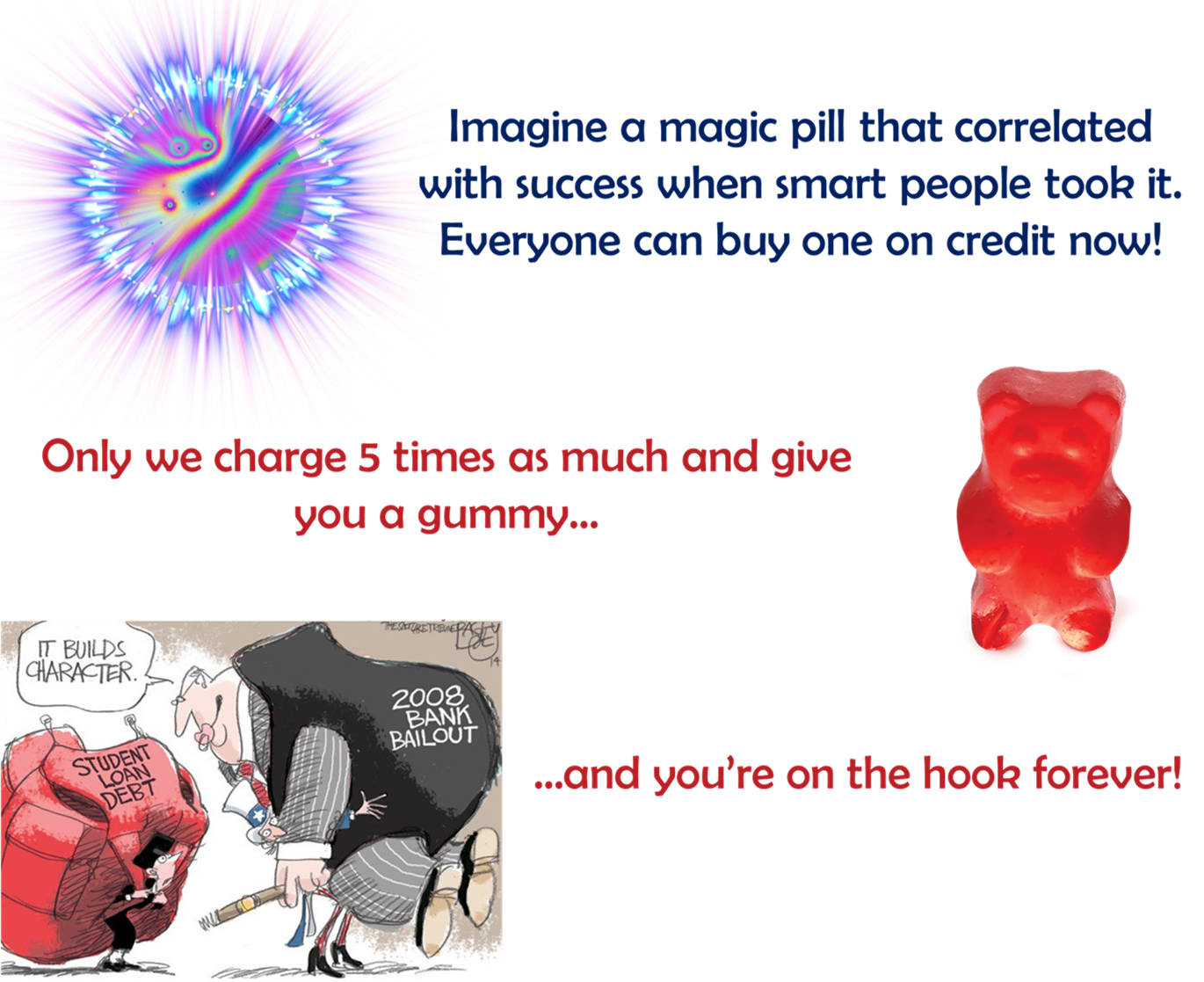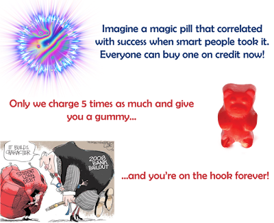 Recognizing that the debt/Education! monster is an obscenity has no relevance to how you feel about the the value of a learned populace. They are fundamentally - ontologically - not the same thing. The greatest culpability falls on the institutions because they took money under the pretense of providing education and did the opposite. Call it the Clinton Haiti redevelopment model. Once you recognize the difference between the abstract principle and the actual application you can make the moral judgment. Were those advocating "reforming" this pile of rotting debris honest about their goals, they would be pushing for a complete tear-down. But they aren't. They want the same swill, just reset back to how it was in decade X.