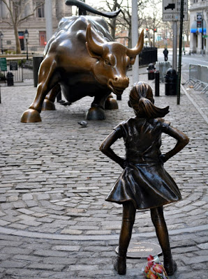 The liars in the media like to refer to Fearless Girl as facing off with or facing down the Charging Bull as some sort of reason-less allegory of something feminine overcoming something masculine through existing.