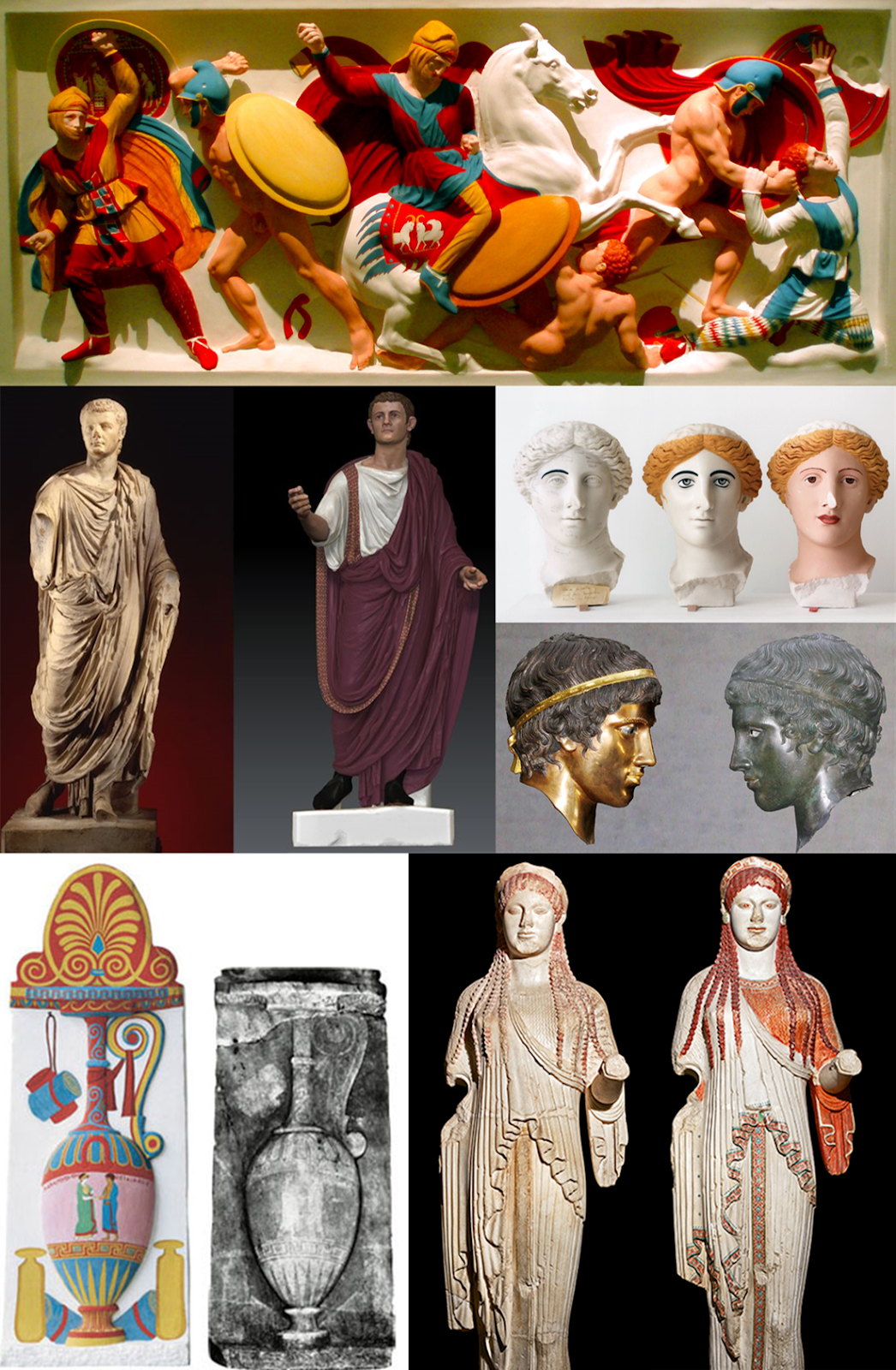 One of the great misconceptions of Classical art is that is was uncolored. Even people who don't know anything about art pictures pure white marble figures when the hear "Greek statue". The reality is that the Greeks and Romans painted their statues and buildings to make them easier to identify and to ratchet up the pathos. Painted figures were more realistic and the intense colors fascinate. The white marble aesthetic was an artifact of the Renaissance, where the rational aspects of Classical culture were pedestalized and the inconvenient irrational ones memory holed.