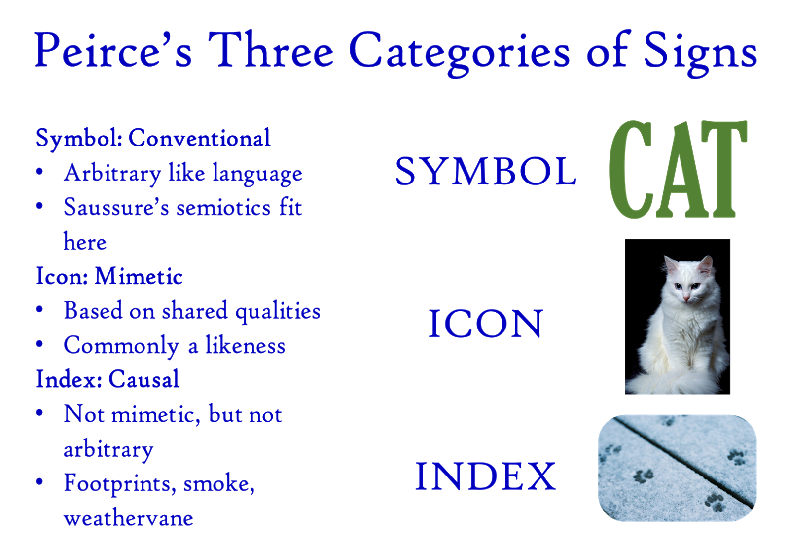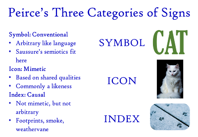 This is a graphic from an early post breaking down 19th century American philosopher Charles Sanders Peirce's semiotic categories. Here is the link if you are interested.