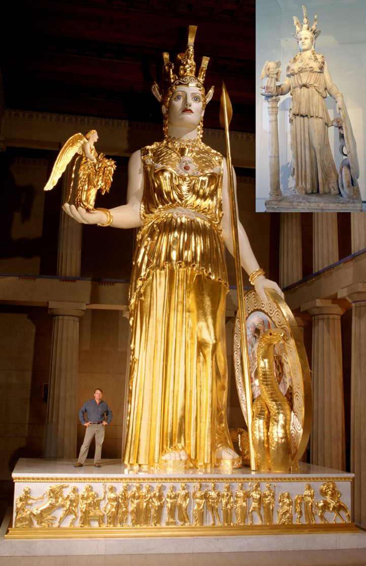 The Athena Parthenos was gigantic cult statue that was celebrated for its artistry and the dazzling impact of its shining chryselephantine - gold and ivory - form. This replica is found in the copy of the Parthenon in Nashville. The inset is a Roman copy of the Parthenos type.