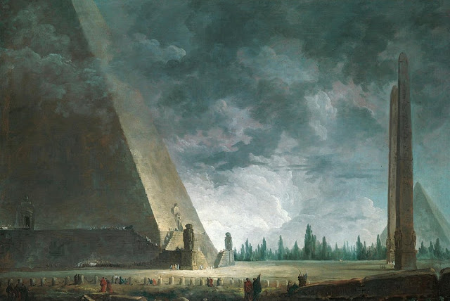Robert painted this before Napoleon brought French researchers into direct contact with Egyptian antiquitues, and the scale is way off. But the exaggerated size and mysterious cloudy setting captures the image of Egypt to later civilizations - the ancient source of the deepest mysteries.