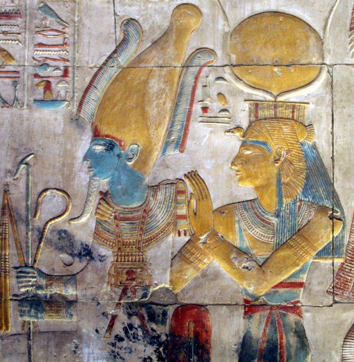 Painted bas relief of Osiris and Isis wearing the headdress of Hathor, 13th century BC, Temple of Seti I, Abydos, Egypt