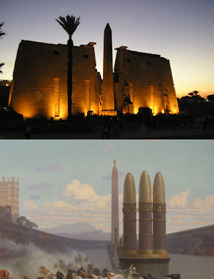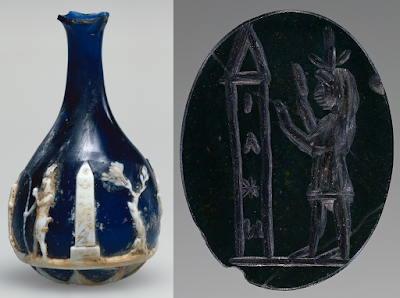 We can see the link between the obelisk as an religious object connected to the alien and mysterious animal-headed gods of Egypt on this flask and carved gem.
