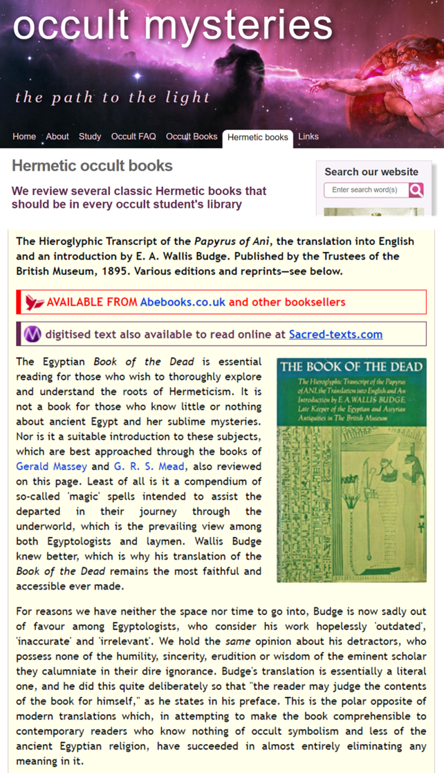 Budge appears to have been a bridge between what we would think of as serious scholarship and occult speculation, ferrying historical material from one to the other. Today, there is an assumption that the supernatural is the opposite to "real" academic study - one is based on ignorant emotionalism and gullibility, the other on impersonally weighing of evidence. One is responsible, the other isn't. Budge reminds us that what a lot of what we think of as serious history was started by loons. This review tells us that his interpretations still have their occult appeal.