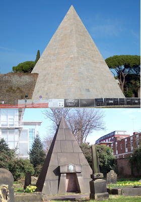 Two steep pyramid tombs almost 1900 years apart. Both draw on the Egyptian associations with death and rebirth. But the very concepts of death and rebirth, what the afterlife is, what the gods are, the nature and meanings of the ritual are completely different for a Roman aristocrat and Victorian gambler. There is no personal connection between Cestius and MacKenzie - each adapts the pyramid symbol to their own worlds.