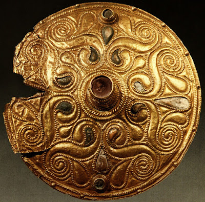 The Sutton Hoo burials are a trove of Anglo-Saxon artifacts with a lot of pieces in very good condition. This clasp shows the common features of Germanic art in general. Abstract patterns with bright colors - especially polished gold and gems - were popular. Note the tangled forms around the edges of the central panels. They aren't that different in spirit from Celtic interlace, but are more knotted. And they include animal forms - there are abstract "heads" with eyes that appear to be biting the tangles.