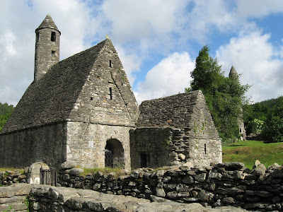 The Insular culture of Ireland developed in relative isolation - as the name suggests. The monasteries that spread over the countryside developed a unique book culture, with scribes creating more and more complex volumes. The Lindisfarne Gospels is a really nice example of their work. The Classical influence is at most implied - codex-type books were Classical innovation, and the preservation of ancient learning in this monastic copying was invaluable for the West. But there is really no Roman influence in the built culture. That looks like vernacular building types that probably go way back in history.