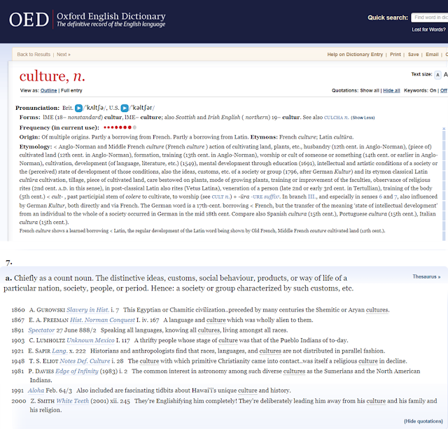Bringing us to the next thing to clarify. We used Roman Christians to illustrate the adaptation of Christian metaphysics in a new material-level culture, raising the difference between culture and nation. The two aren't the same. The Band wrote a post on the differences between nation, state and empire - any one of these can have a culture. Here's the OED:
