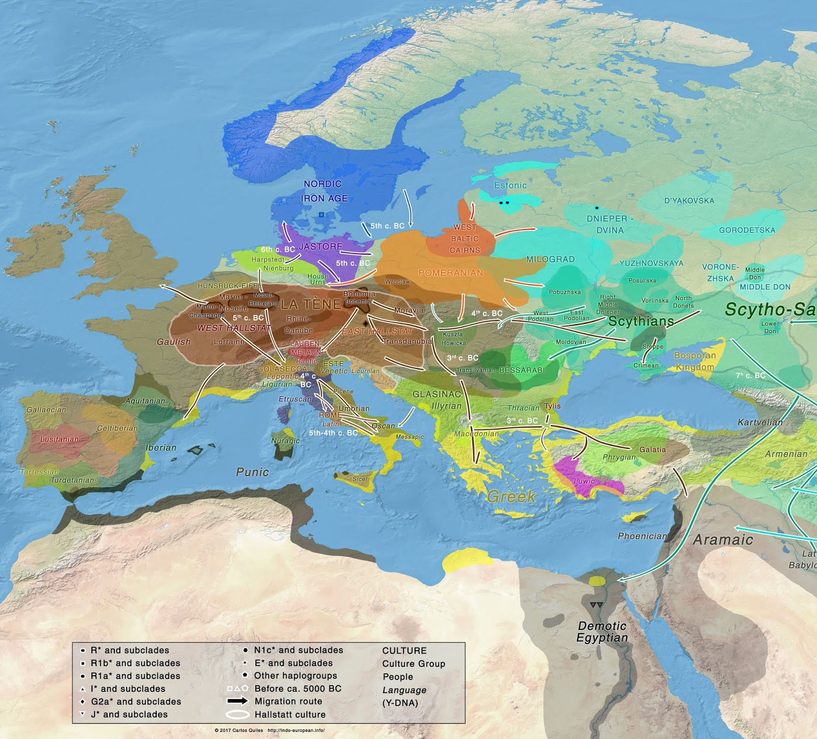 Demographic map of Iron Age Europe showing the principle known cultures and movements of people.