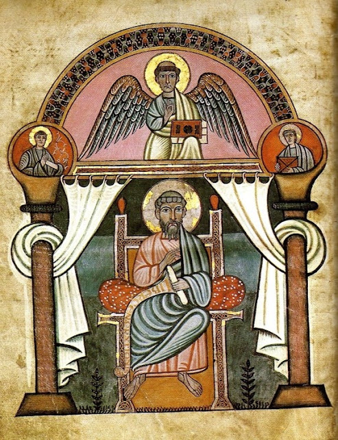 Now look at this page of St. Mark, with his winged lion symbol from the Lindisfarne Gospels: