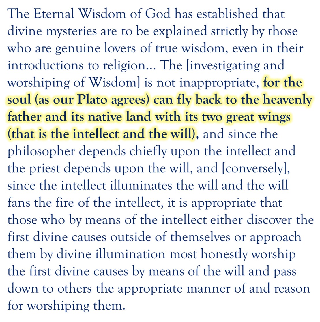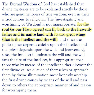 You can see the corruption in the first paragraphs. "Will" and "intellect" as paths to divine Wisdom? Not what isn't there - faith. The one indispensible thing from a Christian perspective. And his authority? Plato.
