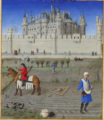 Limbourg brothers, detail from Octtober page in the Très Riches Heures du duc de Berry, f.10v., tempera on vellum, Condé Museum