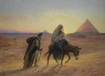 Or the dawn of a new age with the coming of Jesus. The pyramids are in the background - the Holy Family is literally journeying into Egypt but metaphorically moving into the future.