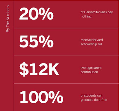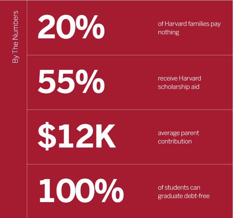 But there's more to it. The majority of Harvard students don't pay these prices, and a good number don't pay at all. Harvard promotes a financial aid program that allows their students to all graduate without debt. Awards appear based on family income - the posted stats tell a very different story from the table above.