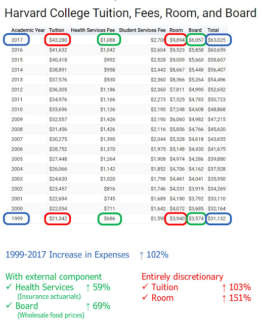 What we found looking up these numbers is worth a quick aside. The Band has hammered the fraudulent university system before, but it's something else to see the raw numbers. The cost of the Harvard undergraduate "package" more than doubled between 1999 and 2017. But the numbers tell more. We selected charges in two categories - things that depend directly on external cost factors and things under the control of Harvard's operations. The increase in the second group is significant, but way less than when the cost doesn't depend so clearly on outside variables. Check out the numbers.