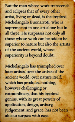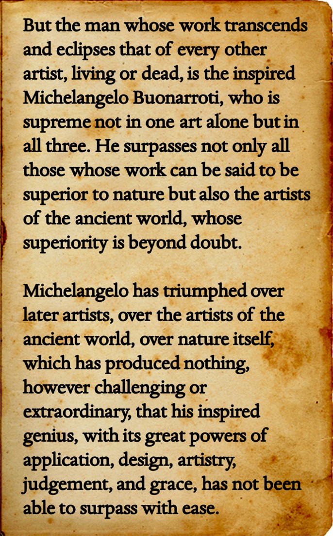 A long excerpt from the opening to Vasari's life of Michelangelo gives a good taste of his bombastic style and pro-Florence, pro-Michelangelo bias