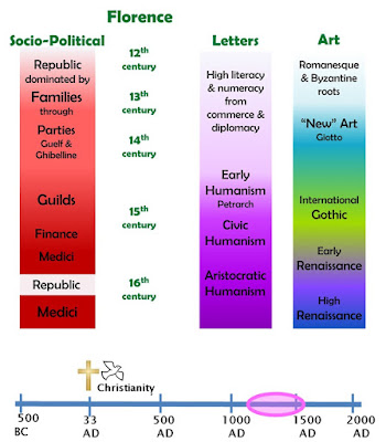 We saw how an area of cultural activity that we can call art really got started in the Middle Ages. Not picture-making - that's way older than writing. But certain kinds of prestigious pictures and the clients, professionals, and first glimpses of secular transcendence attached to them. This comes into its own during the International Gothic that overlaps the Renaissance timeline. Check the Art of the West link above for more on that.