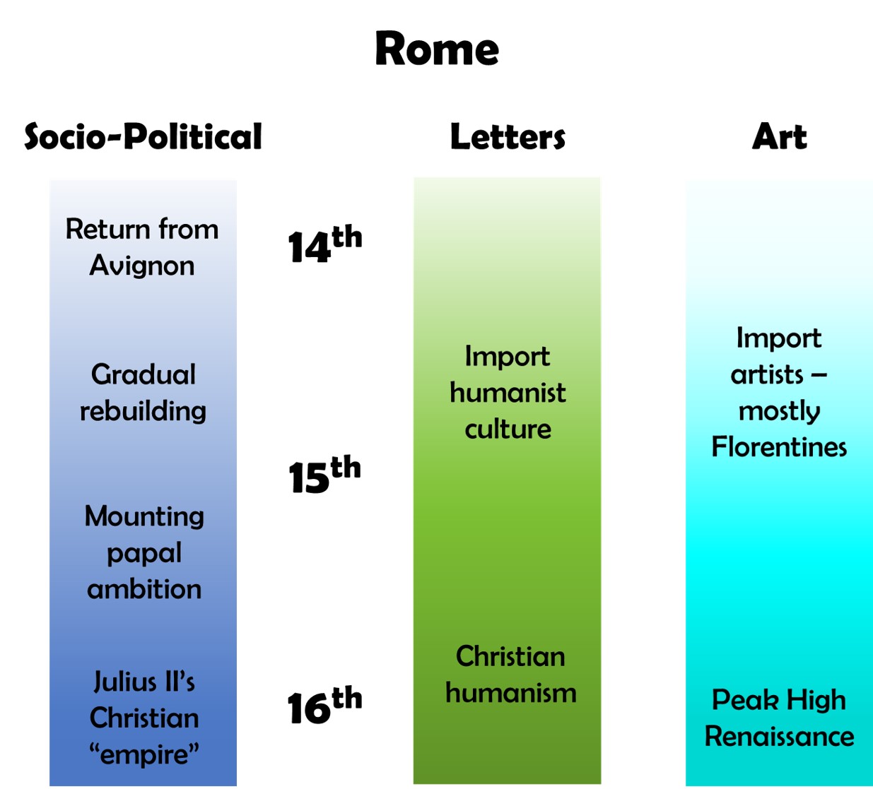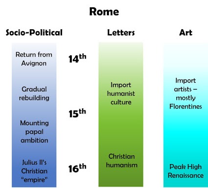 Rome just grows continually as a center of wealth, humanist studies, and art. Eventually it will supplant Florence as the first city of the Renaissance. This happens in the early 16th century, and the result is peak High Renaissance.