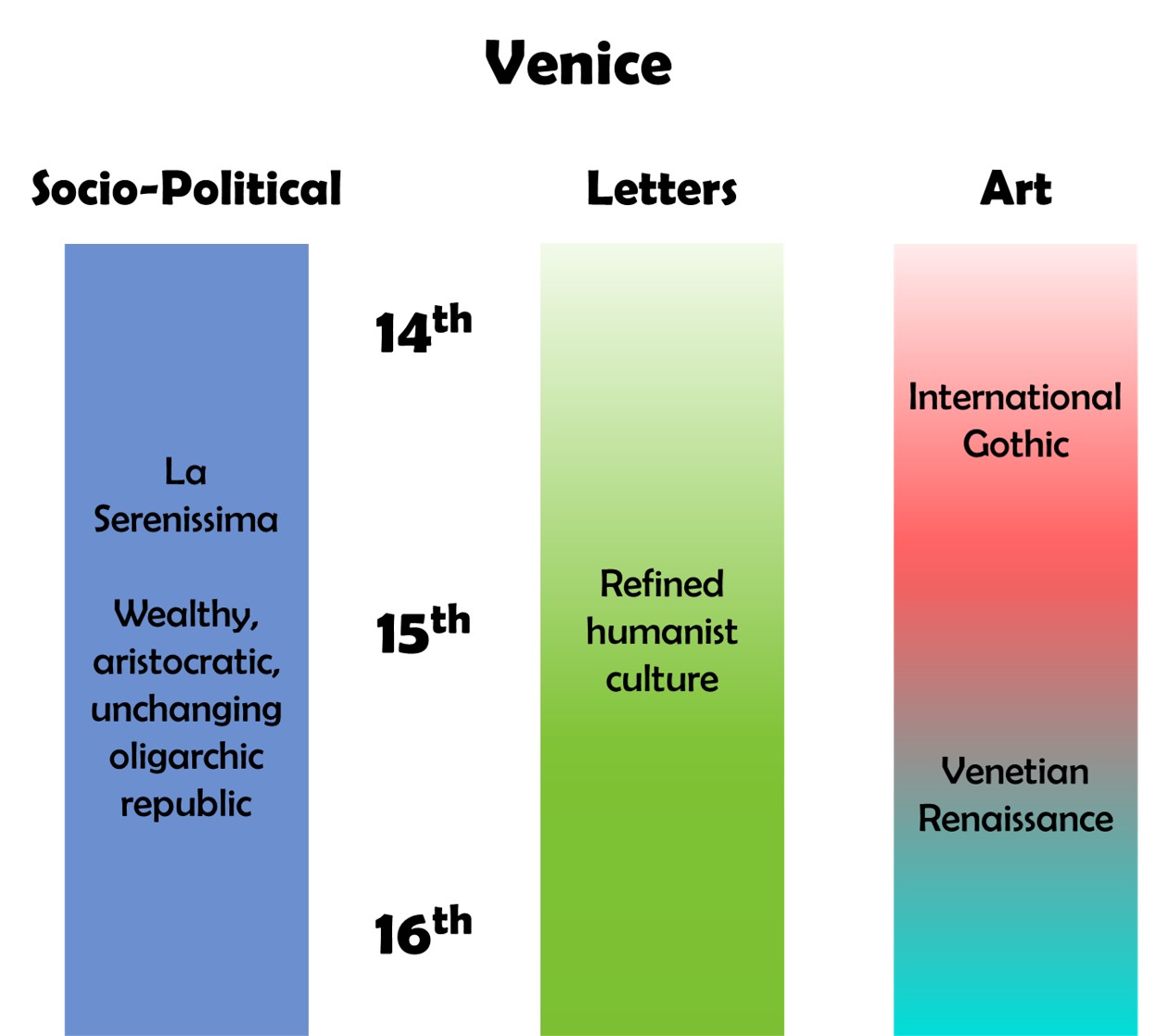 Florence was the main center of Renaissance art and culture but it wasn’t the only one. Other places contributed their own developments on their own timelines. The movement of texts, artists and humanists ensured varying degrees of interaction. On one extreme, Rome winds up supplanting Florence as the center of the mainstream of Renaissance art. On the other, Venice has a tradition that remains distinct from the rest of Italy all through the Renaissance.