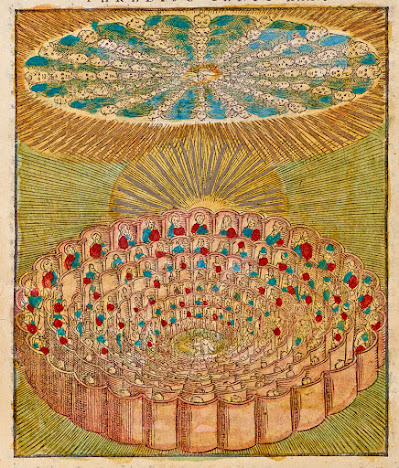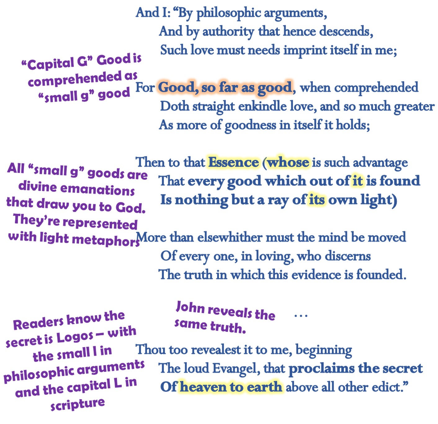 The Divine Comedy shows what the Renaissance will invert - all the pagan skill and techne in the world is irrelevant without Logos. It also show something the Band will hammer on about centuries later - ontological relations can be conceptualized vertically. Consider the relationship between Dante's cosmos and our ontologically as basic patterns. He follows Aquinas and Aristotle by connecting the visible sky with metaphysical distinctions while we are less concrete. But the idea of progress from a Fallen material world through purified logical abstraction to an imperceptible ultimate reality...