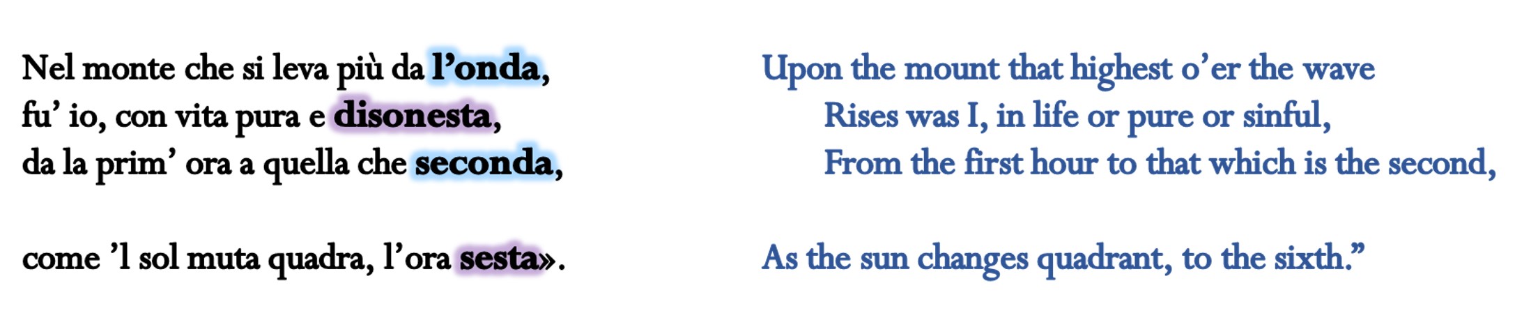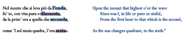 Here's a look at it using the passage from Paradiso canto 26. We've replaced the last stanza in the quote with the actual next one in the Comedy because terza rima flows from stanza to stanza. One alone doesn't show it, and a longer sequence makes it clearer.