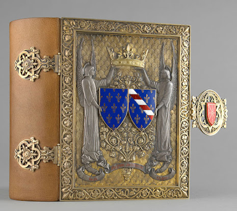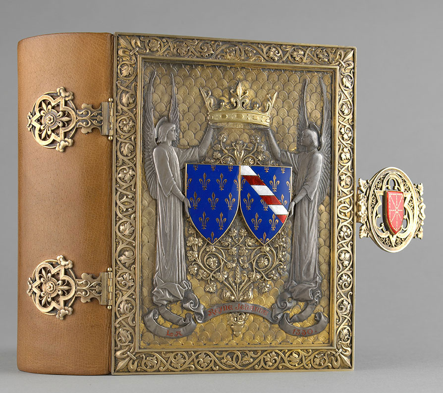 Paul-Emile Froment-Meurisse, cover for the Breviary of Jeanne d’Evreux, a 14th-century illuminated parchment manuscript, 1895, engraved red gold, silver angels designed by Luc-Olivier Merson, enamel shield with arms of France and Evreux, clasp shield with arms of Navarre, chateau de Chantilly.
