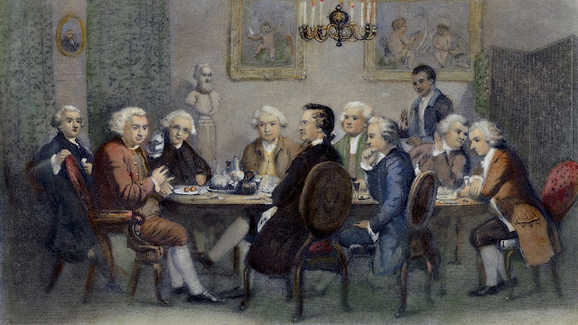 Not that Johnson couldn't write. But without substance that's just entertainment. Diverting word strings. The opposite of lasting value. Or what the modern beast system pretended could replace "values" as foundations of culture. Note the incestuousness of Johnson's "Club", which included head of the Royal Art Academy Joshua Reynolds, epically overrated intellectual flyweight and secular transcendence mouthpiece Burke, and Bozzy.