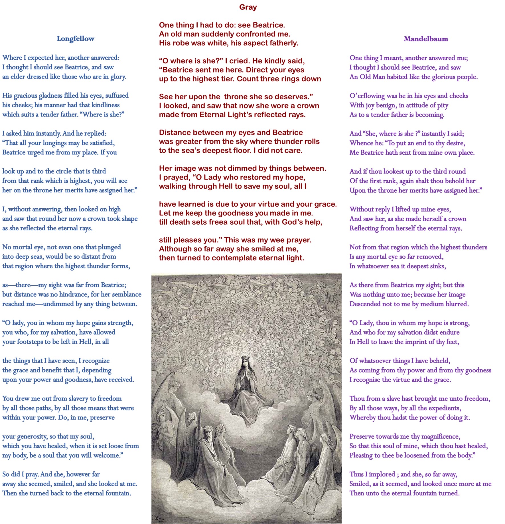 The expert part is important. There are so many translations of Dante - there has to be something to make you want to read one in particular. Gray's liberties with the text include considerable expurgations. Here's an extended quote of Dante spotting Beatrice in the Empyrean Rose that capturesthe aesthetic quality in his more personal language and how much shorter his version can be.