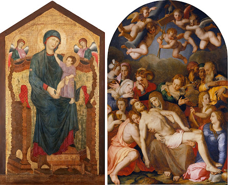 Cimabue, Madonna di Santa Maria dei Servi, 1280, tempera on panel, Basilica di Santa Maria dei Servi, Bologna; Bronzino, The Deposition of Christ, oil on canvas, 1553, Palazzo Vecchio Museum