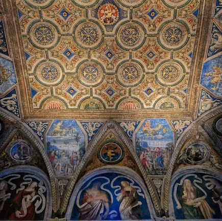 In the 1490s Pope Alexander VI of the Borgia family hired the Pinturicchio - the eminent student of Perugino - to fresco his private apartment within the Vatican palace. they get less attention than they deserve - Pinturriccio would be overshadowed by Michelangelo and especially Raphael within a decade. And Julius II's hatred for Alexander made sure the rooms followed suit. He refused to live in the same suite and moved one floor up. The apartments Raphael painted for him were the replacement quarters.