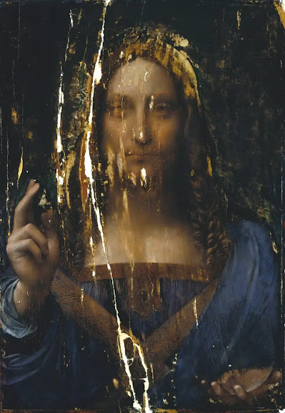 Apparently the painting was stripped down to the original layer of paint - presumably Leonardo's contribution - before the current restoration. Note the two thumbs - the kind of correction artists do when figuring something out. This supports the idea that Leonardo did it - unfinished pieces are standard issue for him. But it calls the "restoration", purchase price, and lack of public appearances into question. Hardly the A-list attraction for a new museum with the Louvre name and Gulf State money.